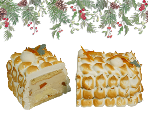 Rafraîchissante omelette norvégienne aux agrumes bio. Biscuit moelleux imbibé d’un sirop léger au Grand Marnier et recouverte d’une meringue flambée.