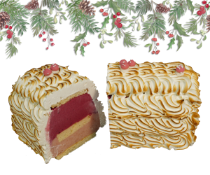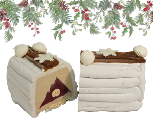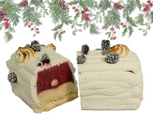 Délicat mélange de sorbet mûre sauvage d’ici et glace vanille du Sri Lanka. Enrobée d’une chantilly légère et ses meringues fondantes.